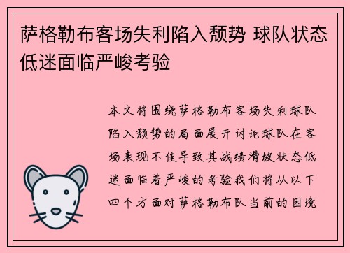 本文将围绕萨格勒布客场失利,球队陷入颓势的局面展开讨论。球队在客场表现不佳,导致其战绩滑坡,状态低迷,面临着严峻的考验。我们将从以下四个方面对萨格勒布队当前的困境做出详细分析:首先,萨格勒布的客场表现和失利原因,其次,球队的战术体系和调整问题,再者,球员状态和士气的低迷,最后,球队如何应对当前的困境以及未来的应对策略。每个方面都会从多个层次进行剖析,力求展现萨格勒布在困境中的全貌,并提出可能的改进方向。