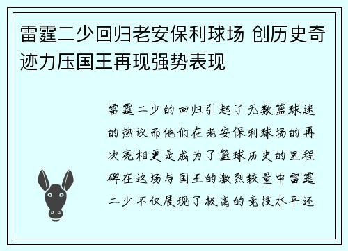 雷霆二少的回归引起了无数篮球迷的热议,而他们在老安保利球场的再次亮相,更是成为了篮球历史的里程碑。在这场与国王的激烈较量中,雷霆二少不仅展现了极高的竞技水平,还凭借着强劲的表现帮助雷霆队力压国王,创造了历史性的奇迹。这场比赛不仅展现了雷霆队整体实力的提升,也彰显了二少的领导力和他们在关键时刻的决胜能力。文章将从四个方面详细阐述雷霆二少回归老安保利球场所展现的强势表现:一是雷霆二少的个人表现;二是二少与全队的配合默契;三是他们在关键时刻的逆转能力;四是球队整体战术的有效实施。每个方面都值得深究,最终,这场比赛不仅为雷霆带来了胜利,更为球迷们带来了无限的回忆和期待。